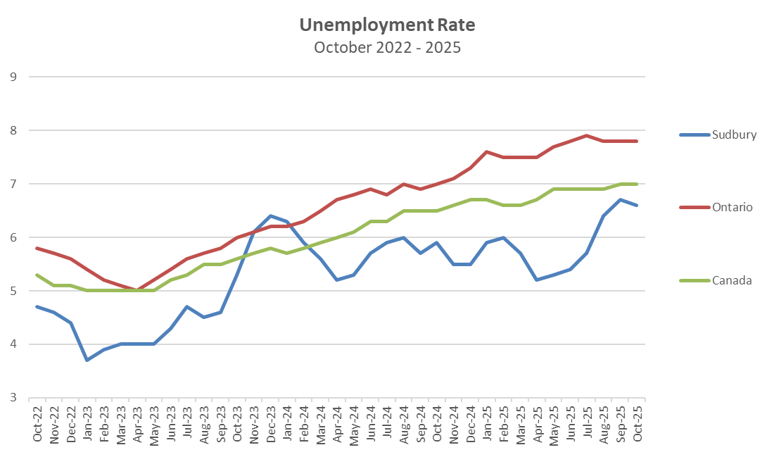 The unemployment rate for Greater Sudbury (Census Metropolitan Area) in October is 6.6%. For comparison, the unemployment rate in Ontario is 7.8% and Canada is 7%.The number of people employed in the city is 95,200, the same as September 2025. Our employment indicator remains fully recovered from COVID-19 impact.The participation rate is 62.6%, a slight drop from September 2025. The participation rate remains below the pre-COVID peak of 65.1% in May 2019.