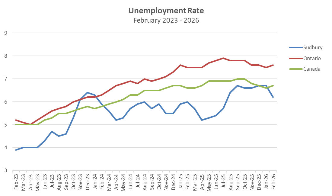 The unemployment rate for Greater Sudbury (Census Metropolitan Area) in February is 6.2%. The unemployment rate in Ontario is 7.6% and Canada is 6.7%.